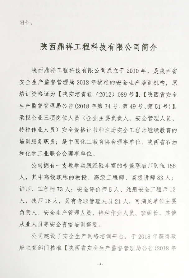 陜西鼎祥始終致力于“以安全科學(xué)技術(shù)為核心,國家安全生產(chǎn)法律法規(guī)為準(zhǔn)則,企業(yè)安全文化為靈魂,創(chuàng)新安全培訓(xùn),提升安全技能,為生命安康護(hù)航”。通過與政府主管部門、企業(yè)之間的協(xié)同效應(yīng),提升安全培訓(xùn)效果!促進(jìn)企業(yè)安全文化建設(shè)不斷發(fā)展!我們將孜孜追求、不懈努力,提升從業(yè)人員安全意識與安全技能,為客戶創(chuàng)造更為安全的生產(chǎn)條件。
